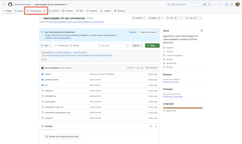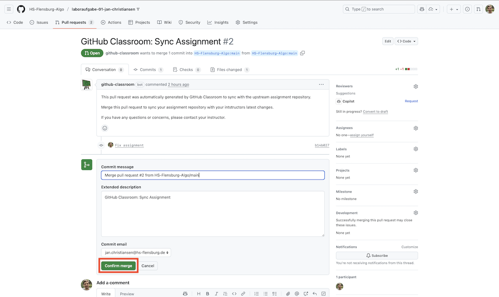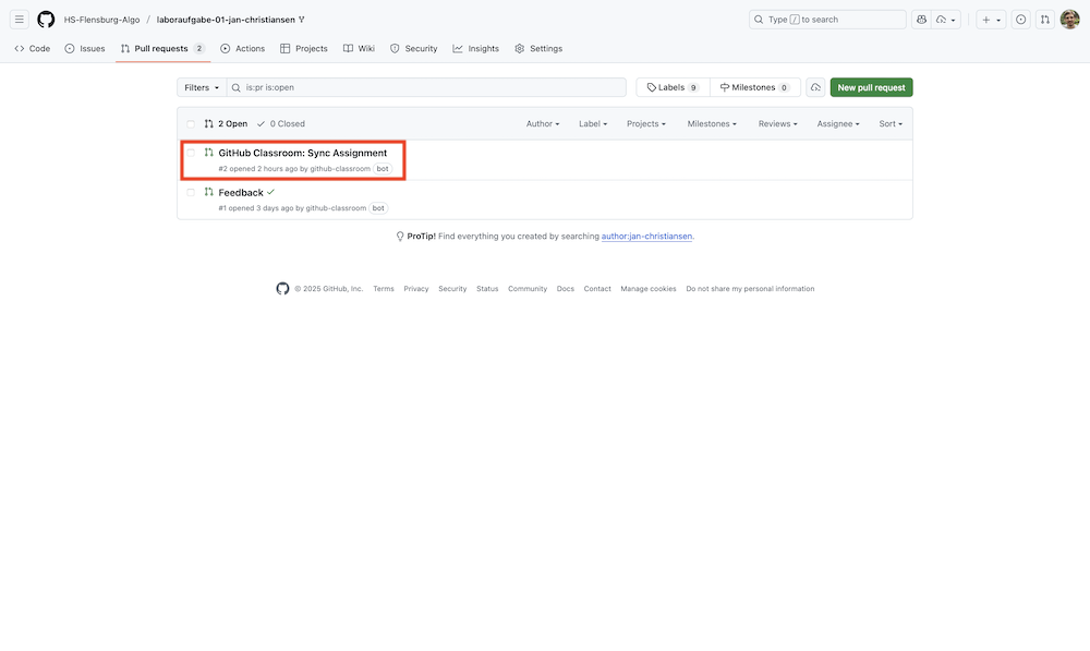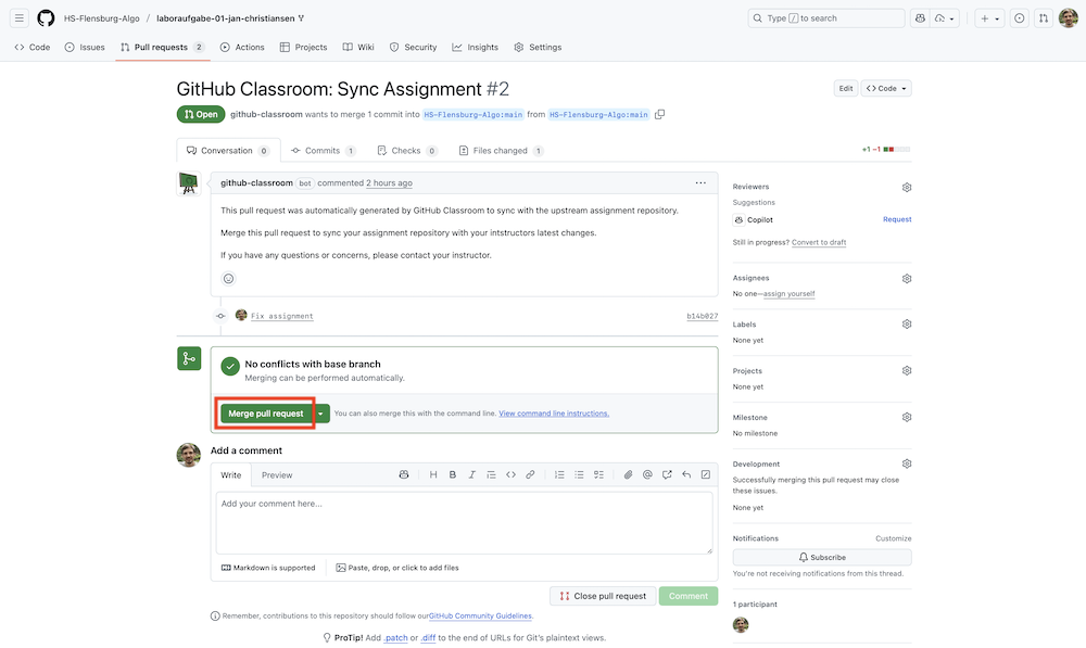 Es sollte in diesem Bereich einen Pull Request geben, der GitHub Classroom: Sync Assignment